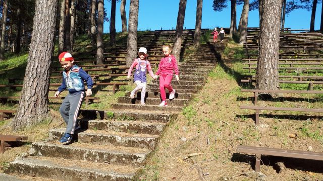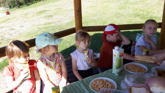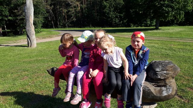 Mažieji keliauninkai apžiūrėjo miško estradą, kurioje vyksta Dainų ir šokių ansamblių šventės. Tada išsirinkome pavėsinę ir kaip tikrieji šeimininkai sutvarkėme aplinką (surinkome šiukšles). Kiek padirbėję, smagiai leidome laiką – sukomės karusele, čiuožinėjome čiuožykla, supomės ant sūpynių, žaidėme su smėliuku. O smagiausia dalis, tai palakstyti per vandenėlį. Smagiai leisti laiką padėjo puikus oras, gera nuotaika. Diena prabėgo nepastebimai ir linksmai.