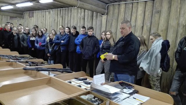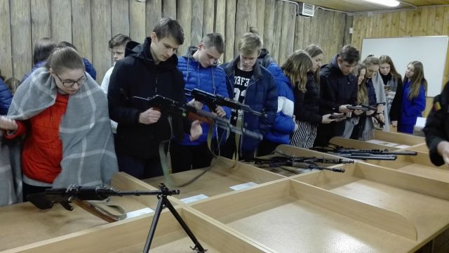 Jaunuosius pasieniečius pasitiko viešųjų ryšių specialistė Gerda. Ekskursiją pradėjome nuo pasieniečių naudojamos ginkluotės apžiūros. Instruktorius paaiškino, kurią ginkluotę pasieniečiai naudoja kasdieniame darbe ir kurią – karo atveju. Mokiniai savarankiškai galėjo susipažinti su dominančio ginklo charakteristika.