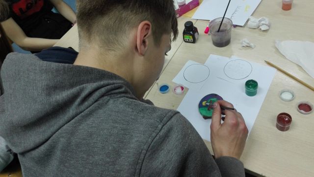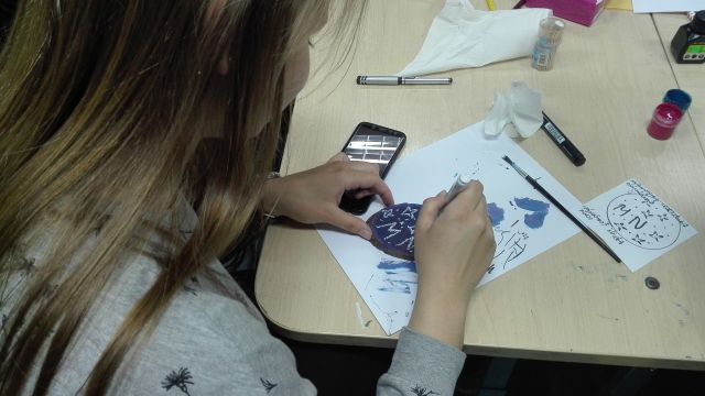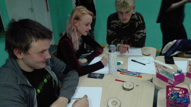 Atėjo laikas ir edukacinėms veikloms. Mokiniai iš popieriaus lankstė, karpė žiedus, kuriais papuošė aktų salėje stovinti medį. Gamino medalius „Muziejų naktis 2019“. Pynė apyrankes, kuriomis pasipuošė patys.